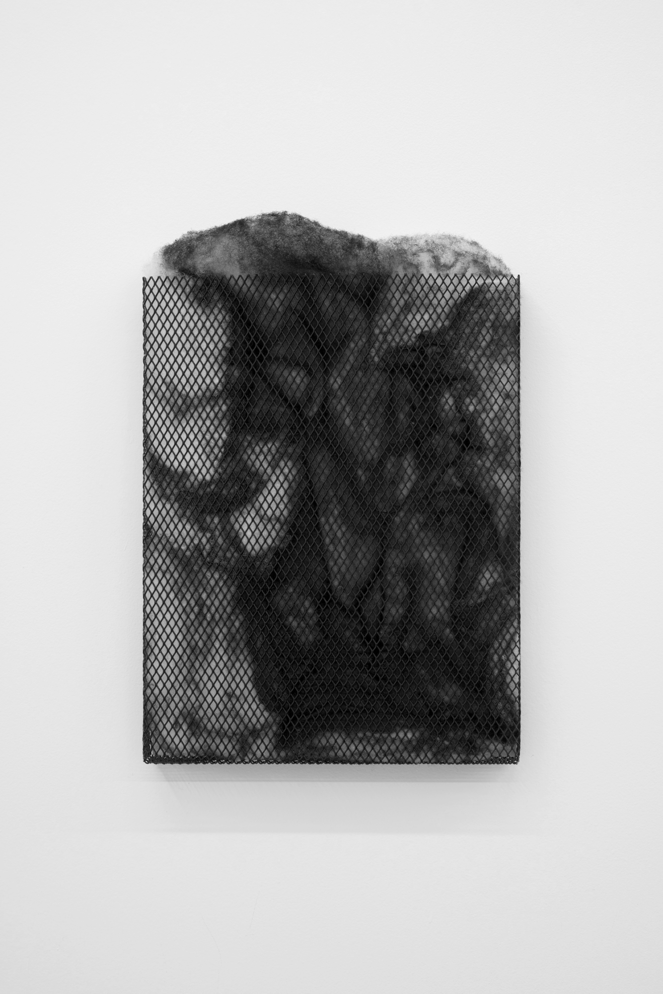 On these portions of material I re-elaborate monochrome stratifications that undergo a process of compression inside a space delimited by metal nets.