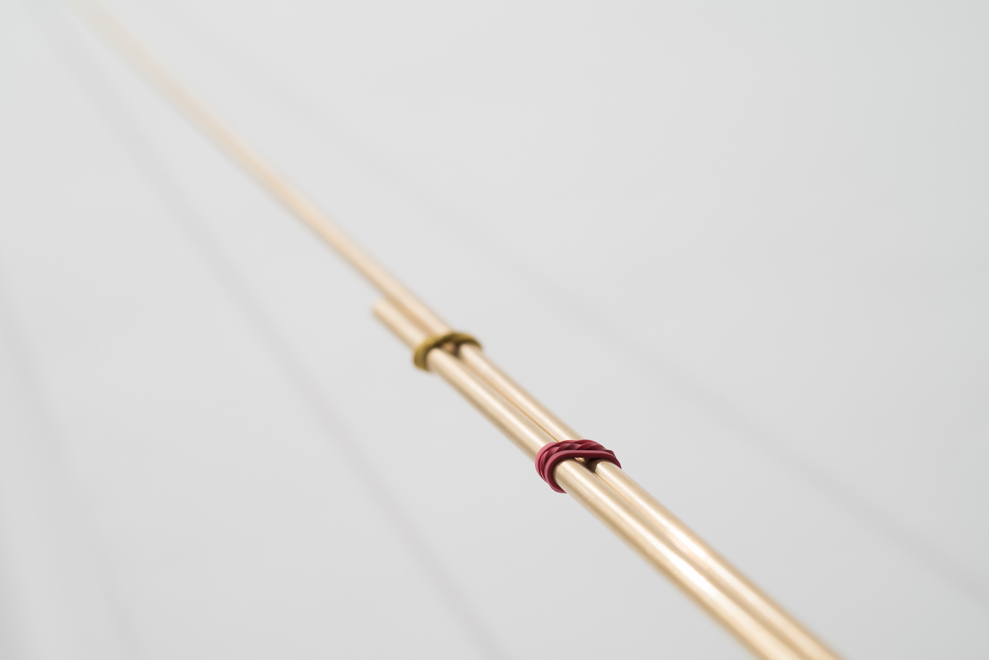 Two brass bars of the same length, ending with two small harpoons, are placed vertically against a corner to compete for “height”.